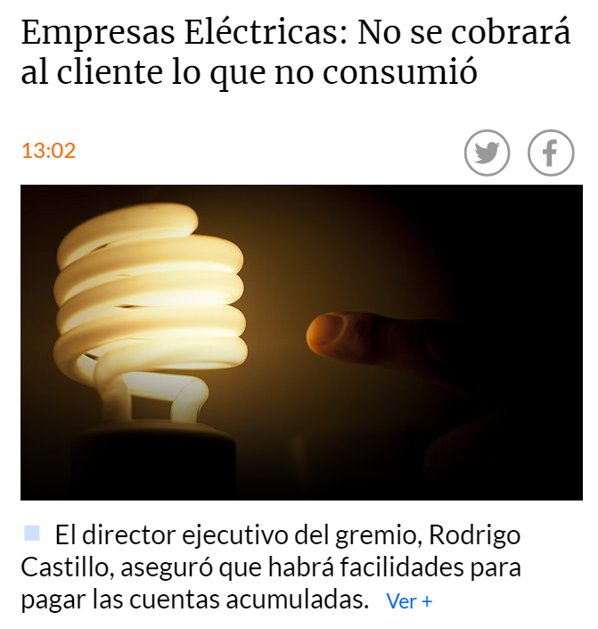 “Considerando que las personas iban a estar consumiendo más energía, que iban a tener menos recursos para hacerse cargo del pago de las cuentas de electricidad durante este período, y que, al mismo tiempo, no podíamos no cobrarle ahora, pero sí cobrarle de una sola vez cuando termine el estado de excepción constitucional, es que se ha acordado que esto sea pagado con cuotas sin interés y sin tipos de multas“, dijo Rodrigo Castillo.