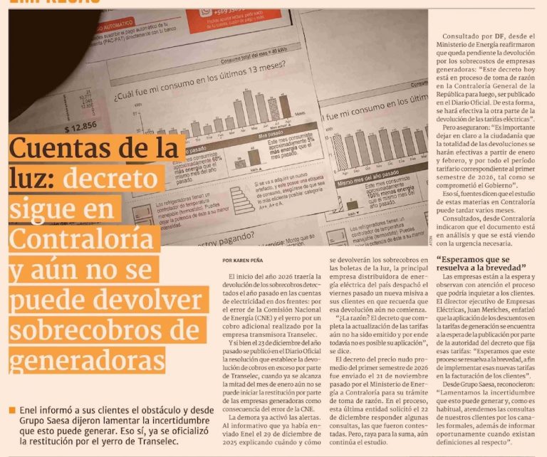 Consultado por DF, desde el Ministerio de Energía reafirmaron que queda pendiente la devolución por los sobrecobros de empresas generadoras: “Este decreto hoy está en proceso de toma de razón en la Contraloría General de la República para luego ser publicado en el Diario Oficial. De esta forma, se hará efectiva la otra parte de la devolución de las tarifas eléctricas”.