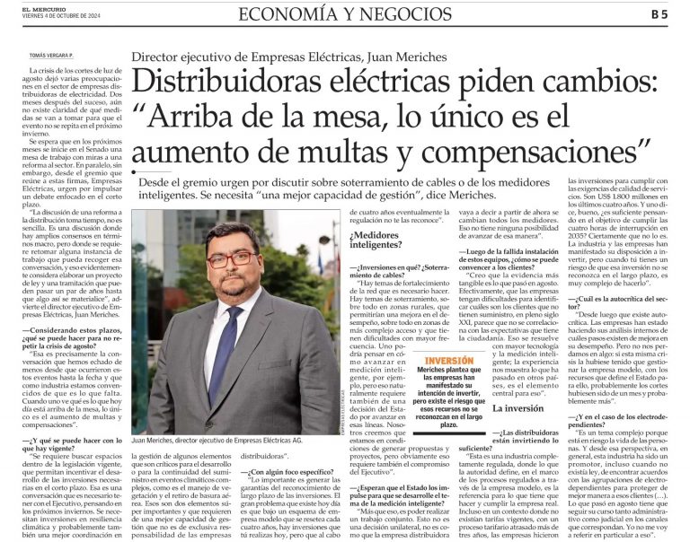 “La discusión de una reforma a la distribución toma tiempo, no es sencilla. Es una discusión donde hay amplios consensos en términos macro, pero donde se requiere retomar alguna instancia de trabajo que pueda recoger esa conversación, y eso evidentemente considera elaborar un proyecto de ley y una tramitación que pueden pasar un par de años hasta que algo así se materialice”, advierte el director ejecutivo de Empresas Eléctricas, Juan Meriches.