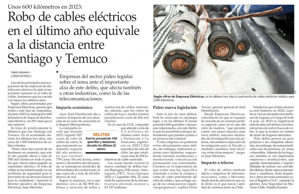Durante 2023 se sustrajeron 600 kilómetros de líneas de distribución eléctrica, un 20% más que el año anterior. “Estas cifras dan cuenta de un fenómeno en aumento, que solo el año pasado afectó a más de 550 mil clientes en todo el país, los que vieron interrumpido su suministro eléctrico. El robo de cables se ha transformado en un problema de seguridad para la provisión de un servicio esencial para la ciudadanía”, lamentó el director ejecutivo de Empresas Eléctricas, Juan Meriches.