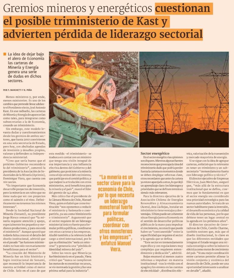 En Sonami se dice que esta medida —el triministerio— se traduciría en contar con un ministro que tenga una visión integral de esa importancia y una influencia efectiva dentro del Gobierno y del gabinete, que posicione a la minería como el puntal del crecimiento; y que también tenga las atribuciones requeridas para articular con los demás ministerios básicos para el desarrollo del país”, marcó la entidad.