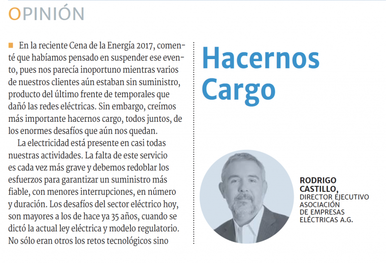 En la reciente Cena de la Energía 2017, comenté que habíamos pensado en suspender ese evento, pues nos parecía inoportuno mientras varios de nuestros clientes aún estaban sin suministro, producto del último frente de temporales que dañó las redes eléctricas. Sin embargo, creímos más importante hacernos cargo, todos juntos, de los enormes desafíos que aún nos quedan.